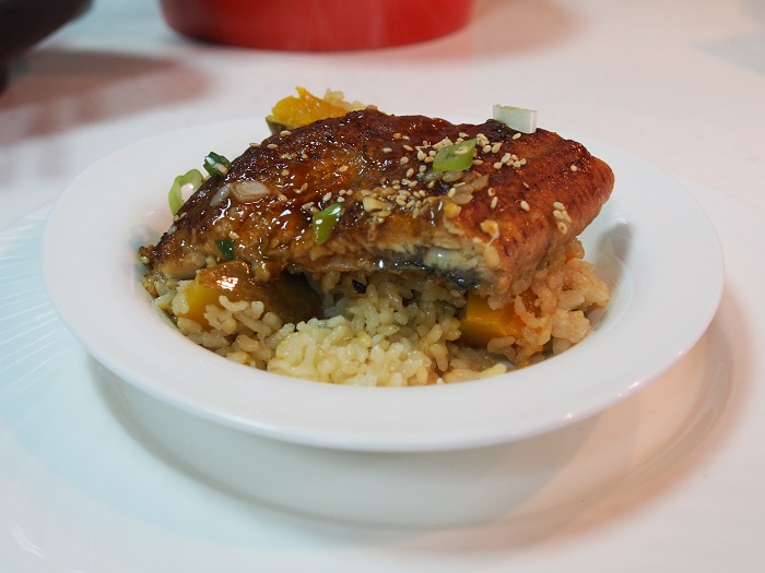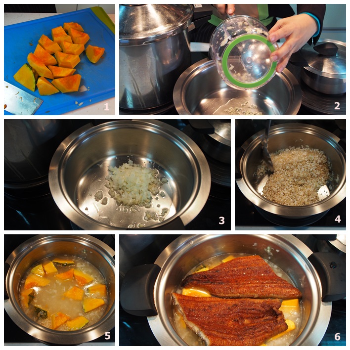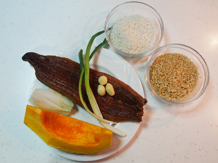 白米1/3杯、胚芽米2/3杯、鰻魚1條、南瓜300g、白芝麻適量、洋蔥1/3顆、蒜頭3顆、青蔥1支。